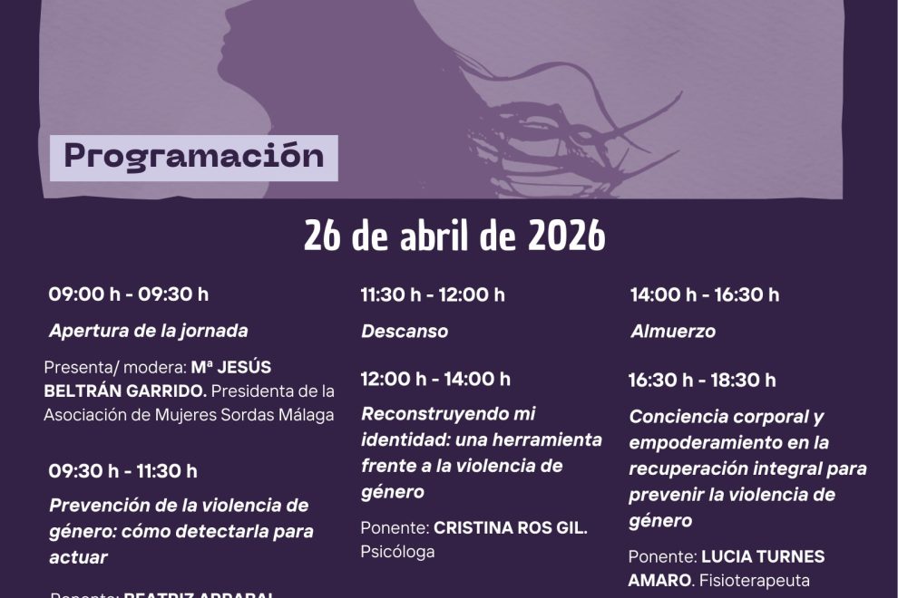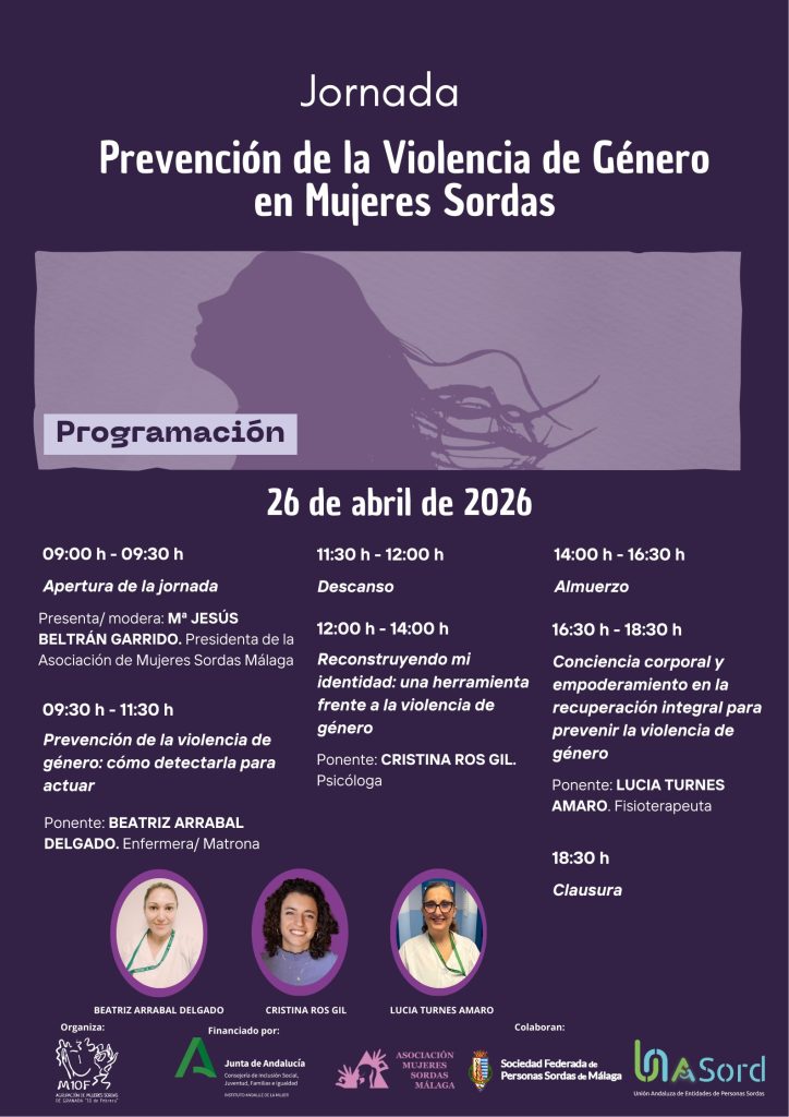 Os informamos de que el próximo domingo, día 26 de abril de 2026, se celebrará en la sede de la Asociación de Personas Sordas de Málaga, situada en Calle Laguinillas, 59. Distrito Centro, Málaga, la Jornada de Prevención de la Violencia de Género en Mujeres Sordas. Toda la información la podéis encontrar en el programa y en el vídeo.