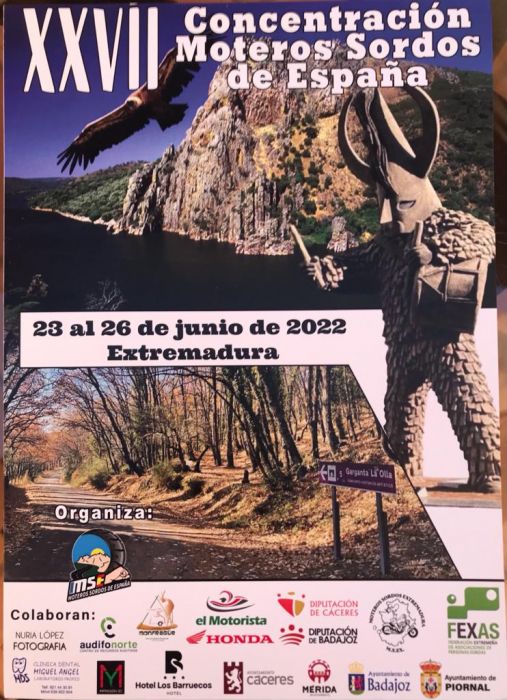 Grupo de moteros y moteras de la Comision de ASOGRA, encabezada por Carlos Rivero, en la XXVII Concentración Nacional Motera en Extremadura. ¡Granada no podía faltar!!100 moteros sordos vienen a Extremadura. Los moteros de la Asociación de personas sordas de España se junta cada año y se van de ruta para conocer una región del país. Este año la elegida ha sido Extremadura. Han visitado lugares emblemáticos de Mérida, donde han entrado con sus 100 motos acompañados por la Policía Local.